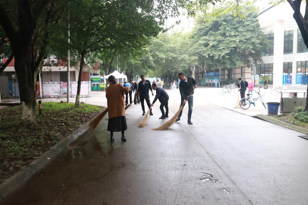 本次活动由杨院长和阴院长亲自带领师生党员对五谷堂公共区域进行了彻底的清理,对食堂入口及周边道路区域的树叶、纸屑及绿化带内杂草杂物进行了大扫除。整个活动分工有序,领导带头,全员参与,充分展现出开云官方版在线入口师生不怕脏、不怕累、不怕苦的劳动精神。活动不仅营造了整洁卫生、舒适有序的学习工作生活环境,引导师生自觉养成卫生健康、守序文明的生活习惯,也极大地提高了师生的凝聚力和向心力。