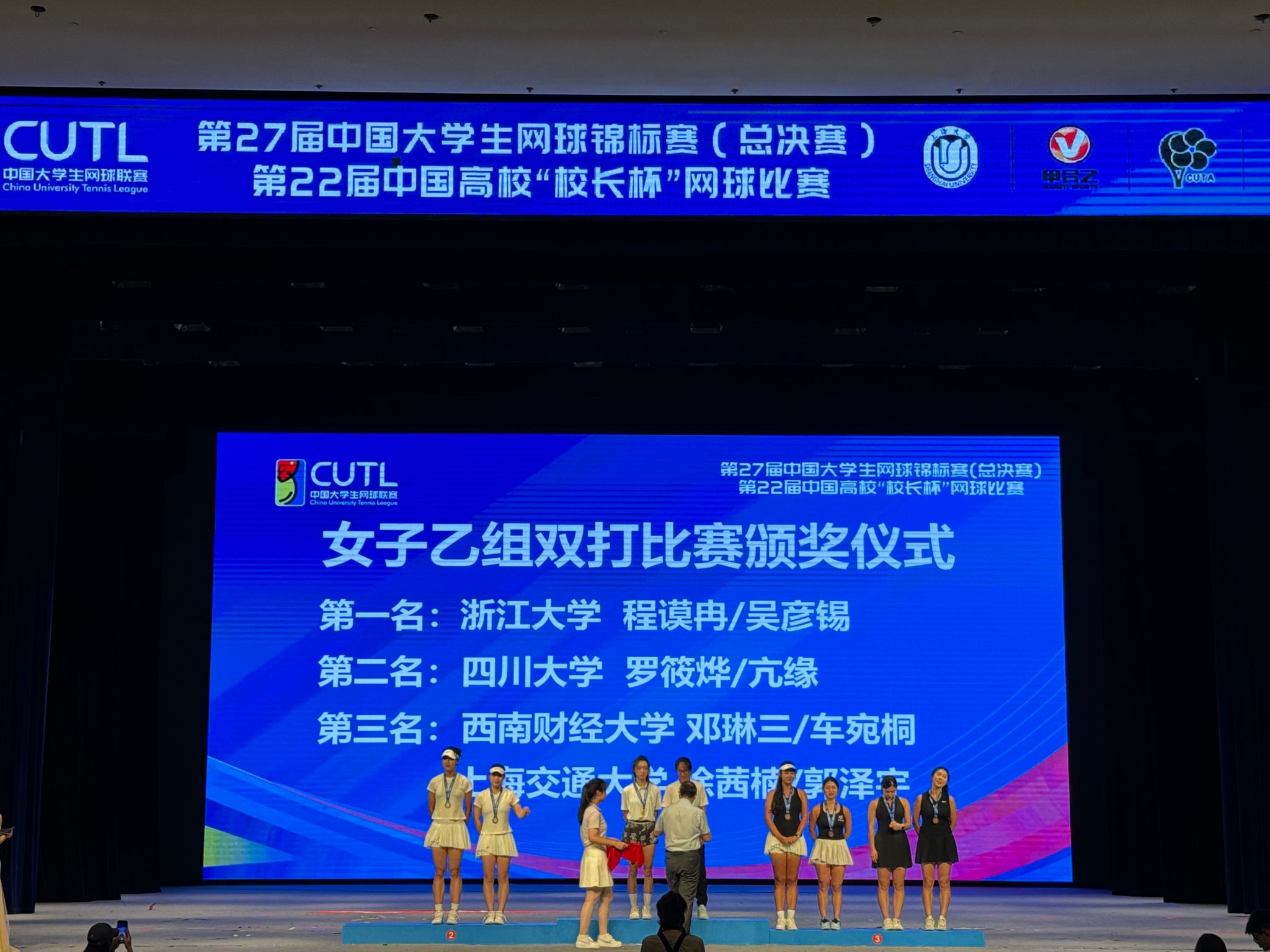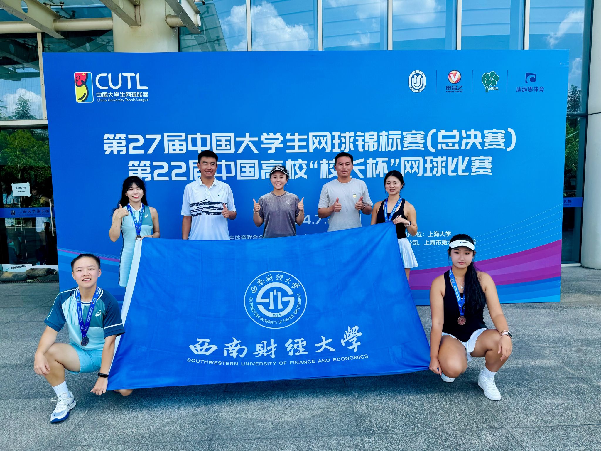 7月22日-8月1日,第27届中国大学生网球锦标赛(总决赛)在上海大学(宝山校区)举行。中国大学生网球锦标赛是我国大学生层面最顶级的网球赛事,经过八大分区赛的激烈角逐,在本届中国大学生网球锦标赛(总决赛)中,共有来自全国132所高校的915名同学成功晋级总决赛。参赛规模创历史新高!开云(中国)网球队在前期分区赛上表现突出,成功晋级总决赛,11名运动员代表学校参赛,孙巨杉、施泓宇、孔星宇担任教练。经过八天的激烈角逐,西财健儿们在强手如林的赛场上顽强拼搏,团结奋进,获得女子普通高校甲组双打季军和女子高水平乙组双打季军的好成绩,充分展现了西财学子的精神风貌和青春风采,为即将到来的西财百年华诞献礼!