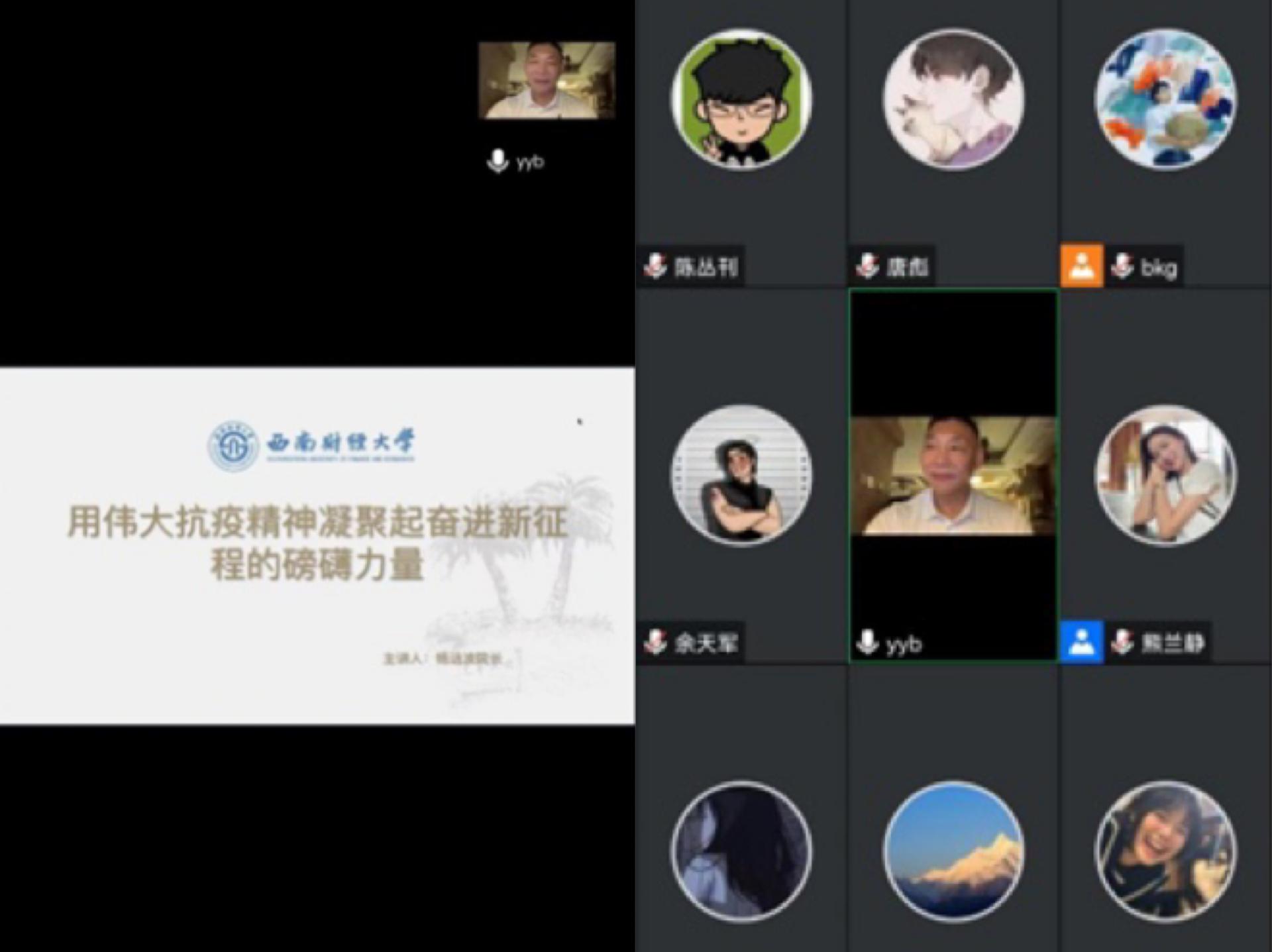 最后,杨院长督促学生做好个人防护并关心学生学习生活情况,帮助解决学生在校期间存在的问题和困难,最大程度减少疫情对学生健康和学校安全稳定造成的危害。请同学们坚信,在学校党委的坚强领导下,全校师生员工齐心协力、众志成城,我们一定能够以最坚决、最有力、最有效的举措,全力守护师生健康安全,打赢这场疫情防控攻坚战阻击战歼灭战,以实际行动迎接党的二十大胜利召开!学院副院长陈丛刊,副书记李治,辅导员毛思程参加线上课程。