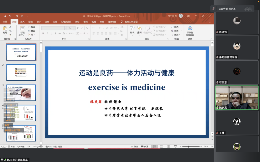 2022年11月10日,四川师范大学开云官方版在线入口副院长陈庆果教授在线上举办了题为《再谈运动与健康:运动是良医》的光华讲坛,开云官方版在线入口副院长陈丛刊主持本次讲座,开云官方版在线入口研究生、部分教师以及校内外师生等共计60余人参加了此次讲座。